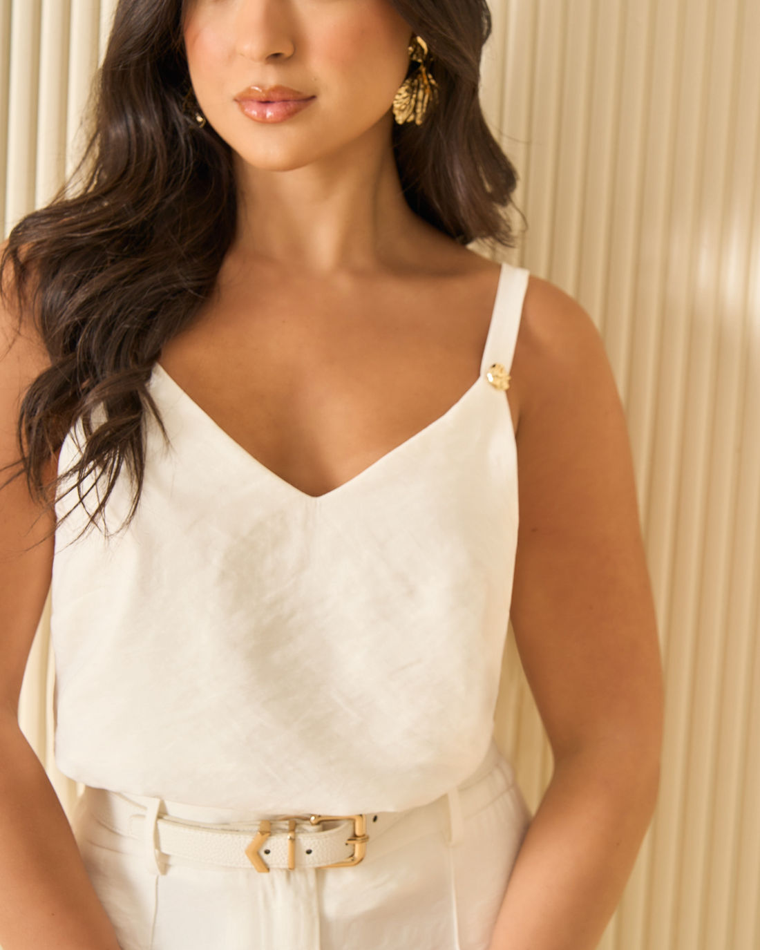 Regata em twill é a peça perfeita para compor produções elegantes e versáteis. Confeccionada em tecido encorpado com caimento sofisticado, possui design clean com detalhe de botão que valoriza o visual com um toque moderno.