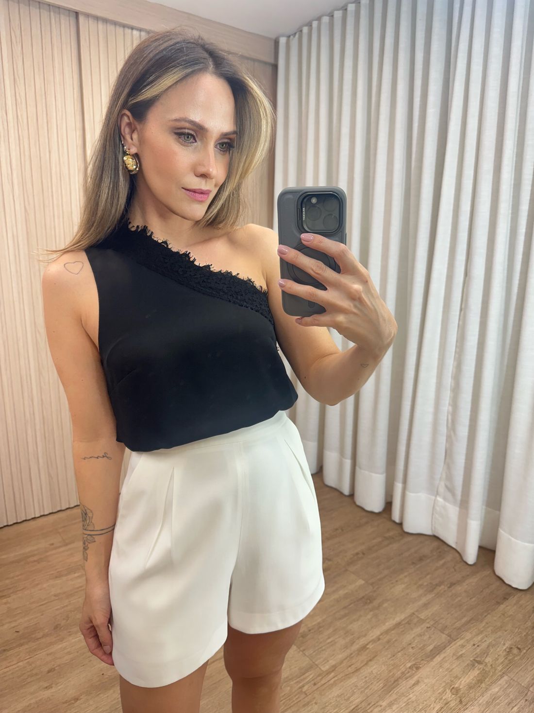 O design assimétrico valoriza o colo, enquanto a renda adiciona charme delicado.