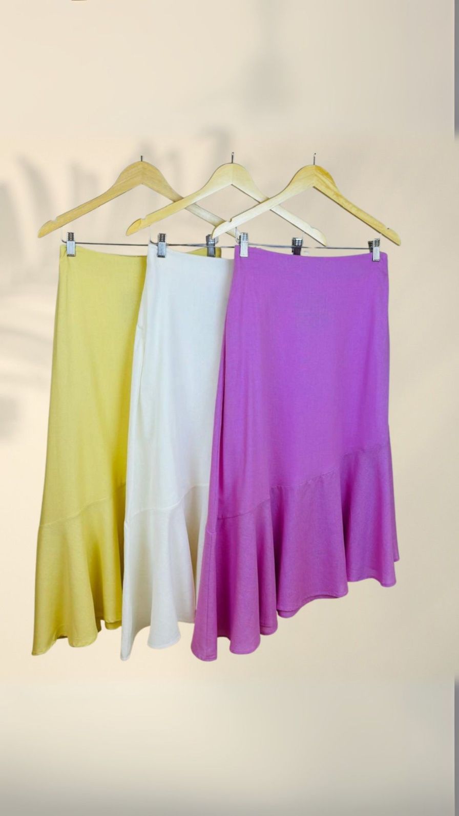 AdicionarConfeccionada em linho misto, esta saia apresenta modelagem midi com recorte diagonal e detalhe de babado na barra, que cria movimento e fluidez ao caminhar.