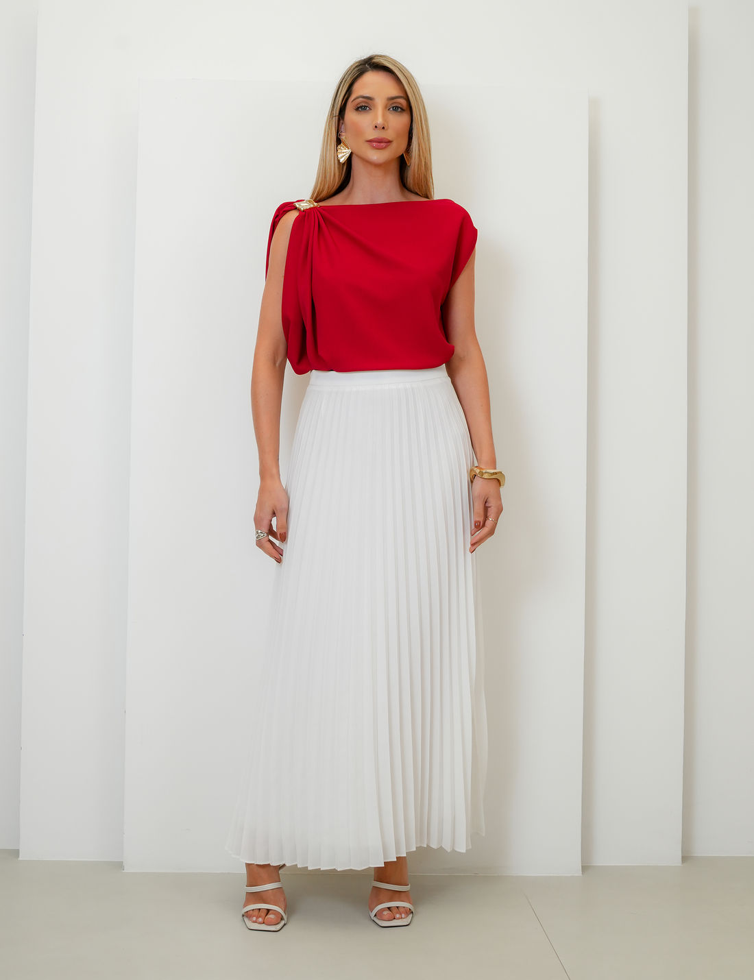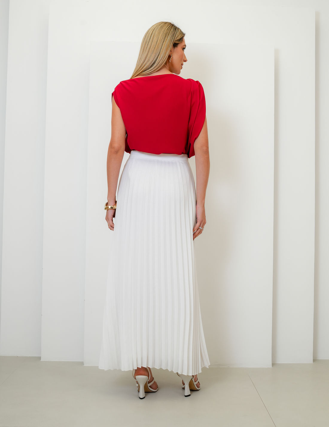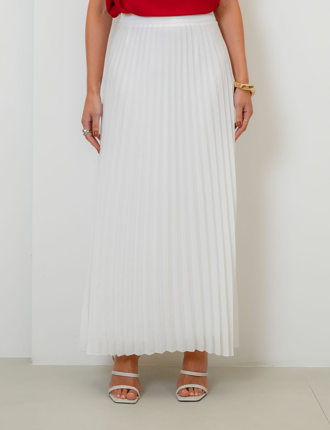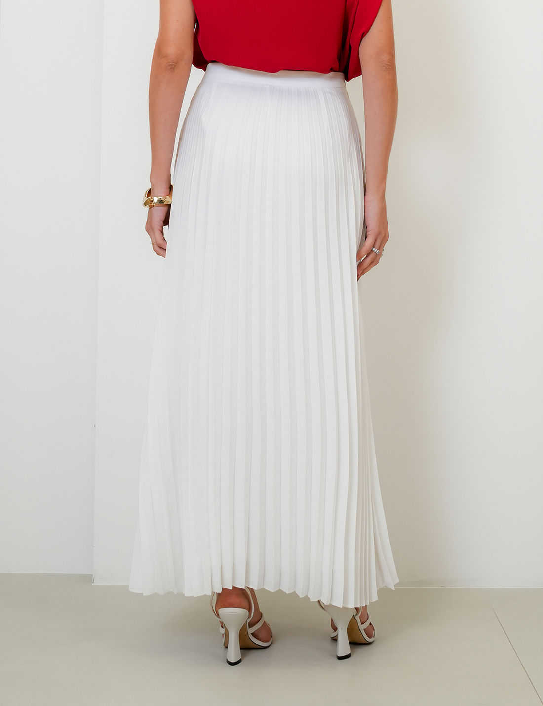 Saia longa confeccionada em tecido leve e fluido com acabamento plissado que garante movimento e elegância a cada passo.
