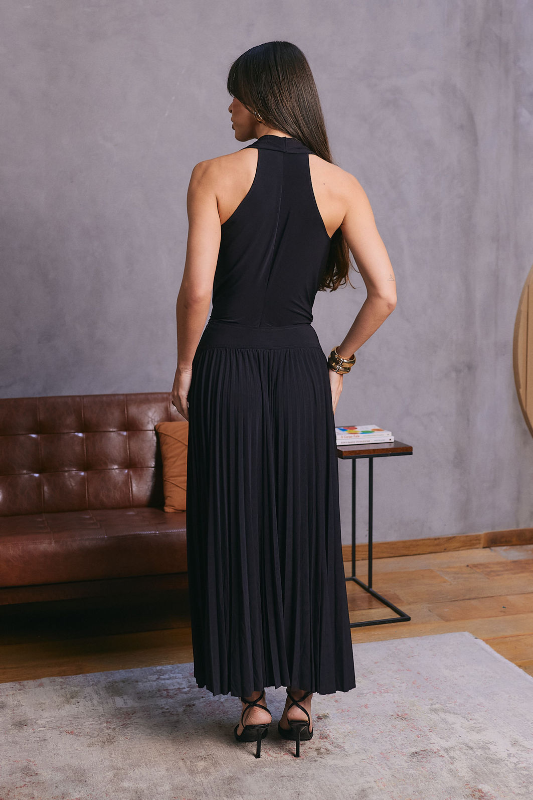 O fechamento lateral é feito por zíper invisível, garantindo acabamento delicado.