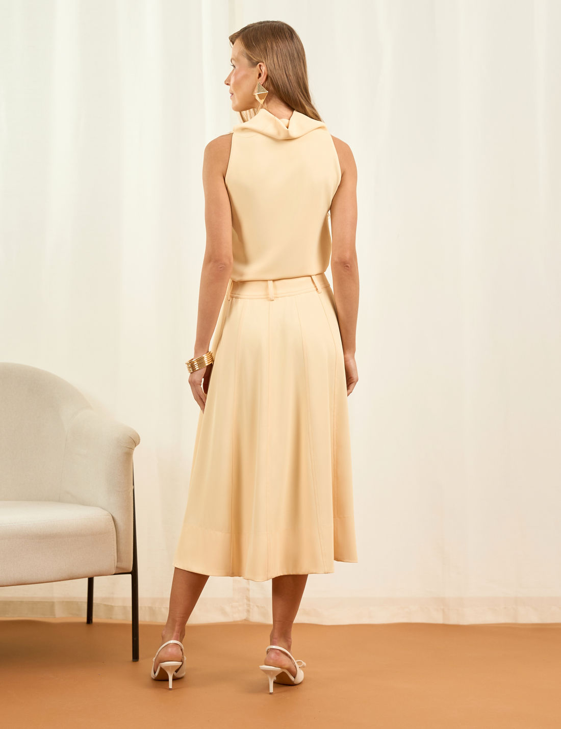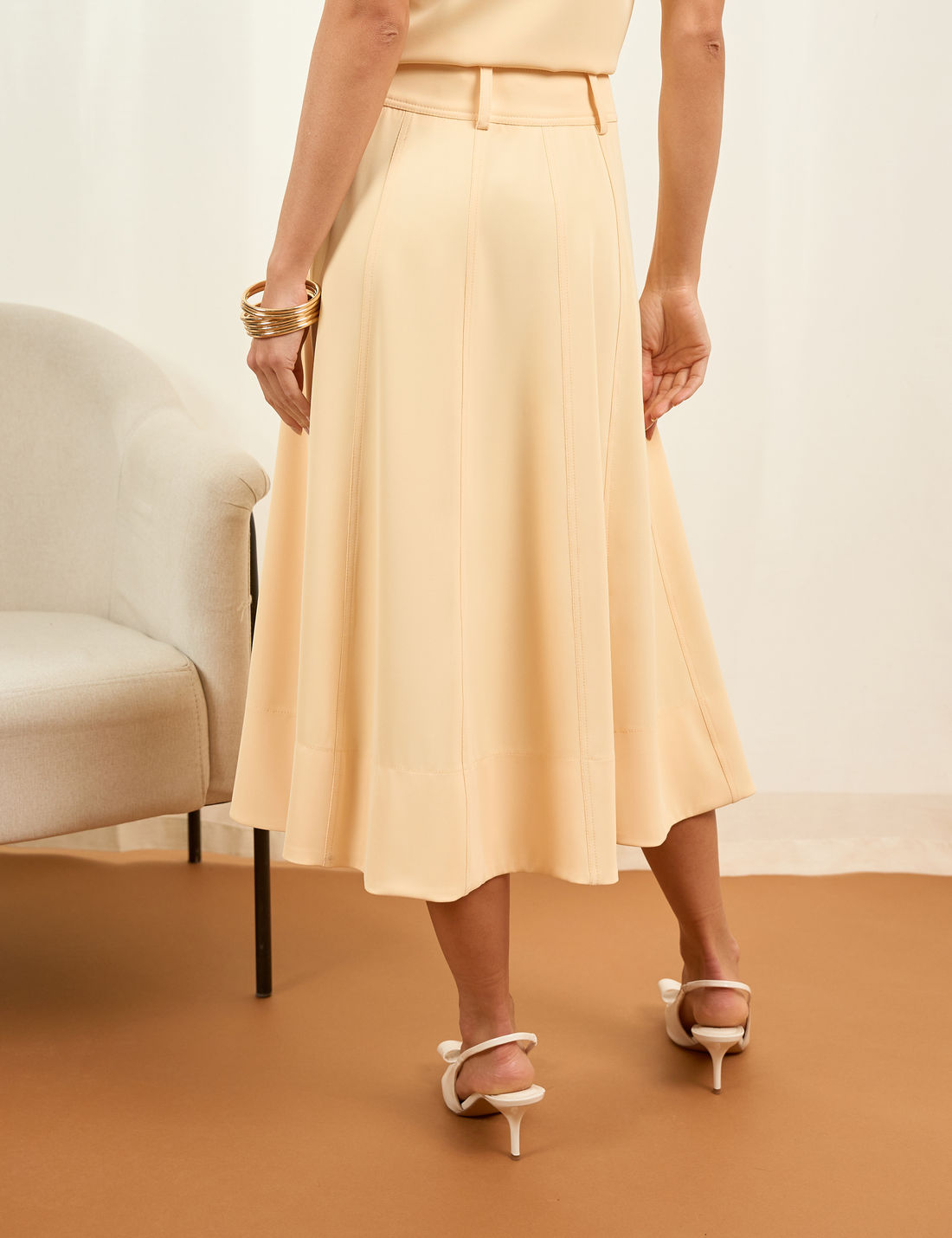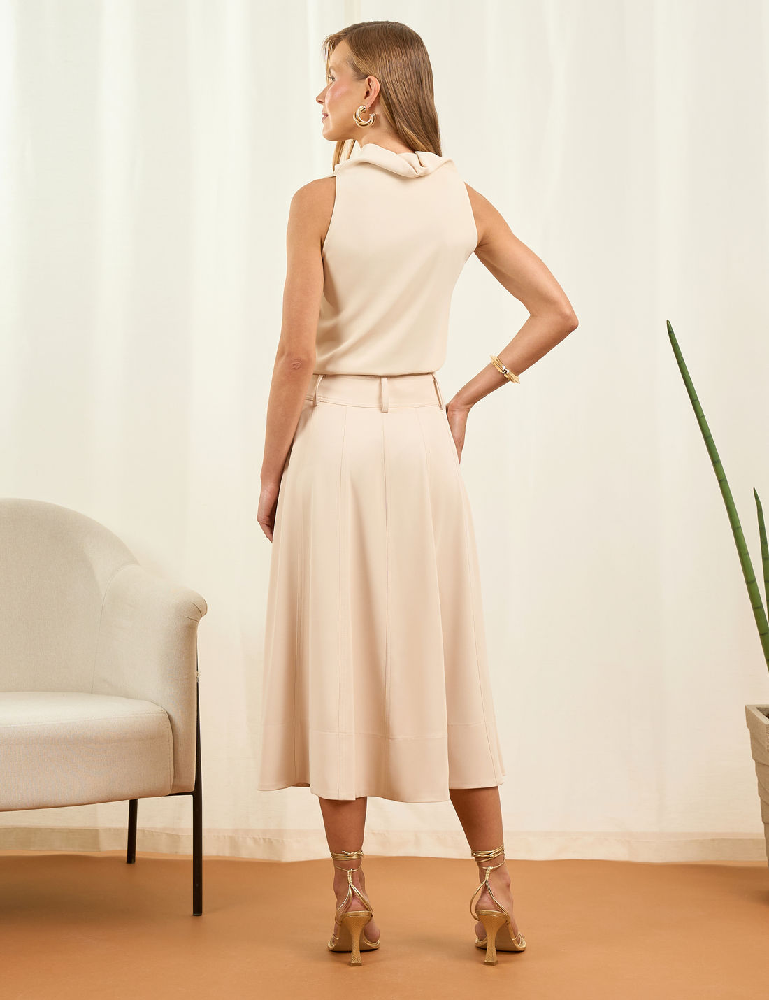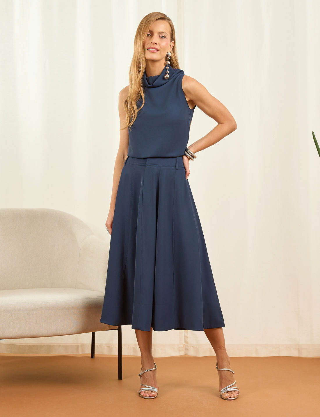 AdicionarSaia confeccionada em tecido plano, com modelagem de alfaiataria que proporciona caimento fluido e valoriza a silhueta com elegância. Apresenta cós com passantes fixos, recortes frontais e posteriores.