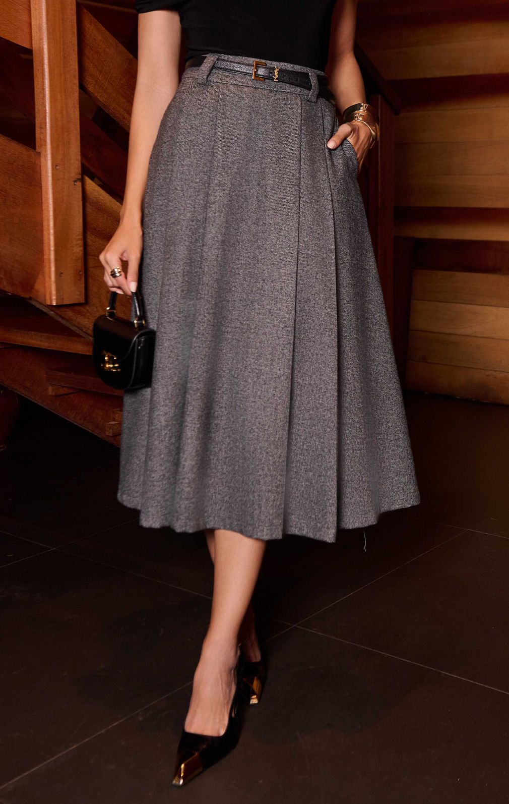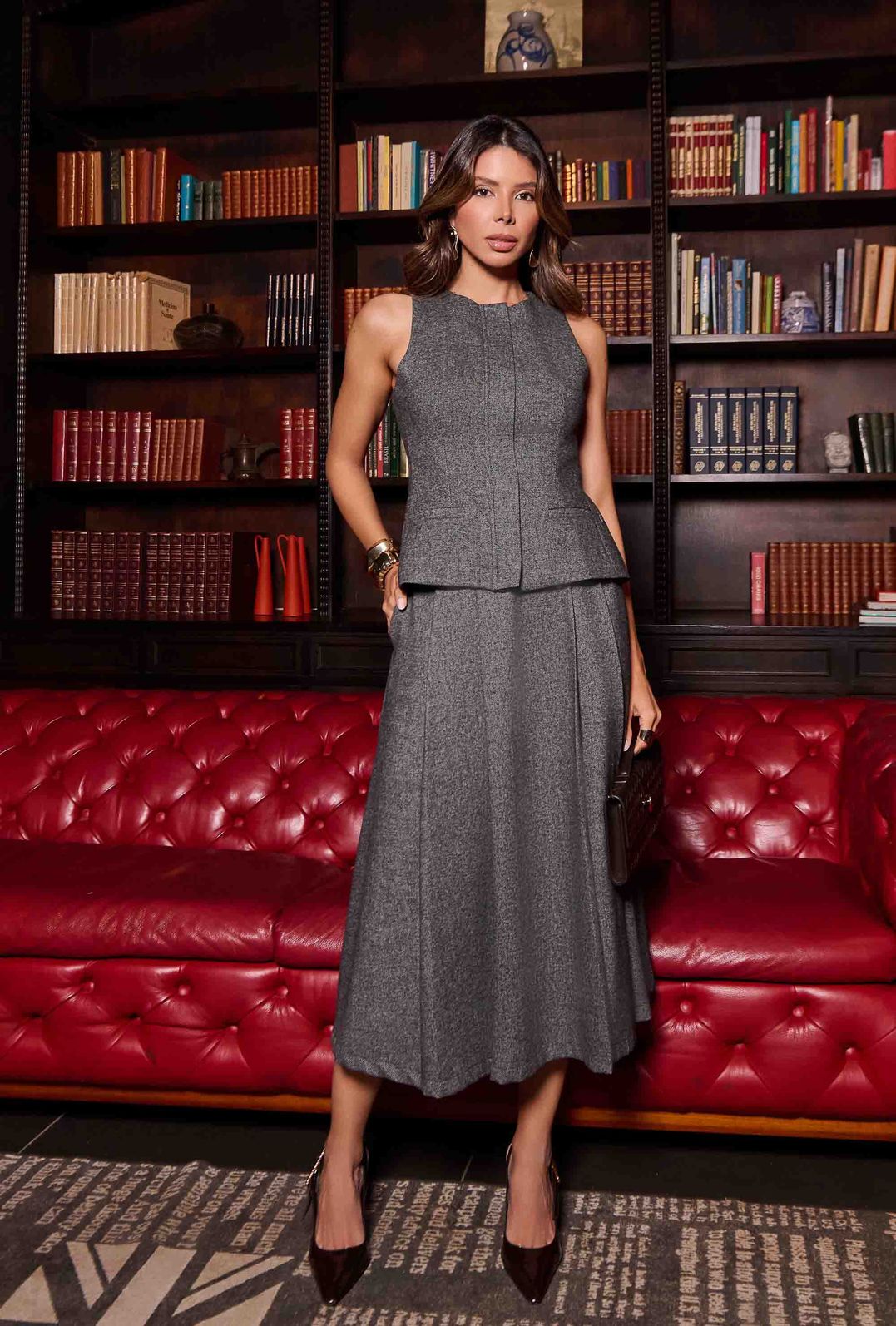 A saia midi em alfaiataria é a escolha perfeita para quem busca elegância atemporal com sofisticação.