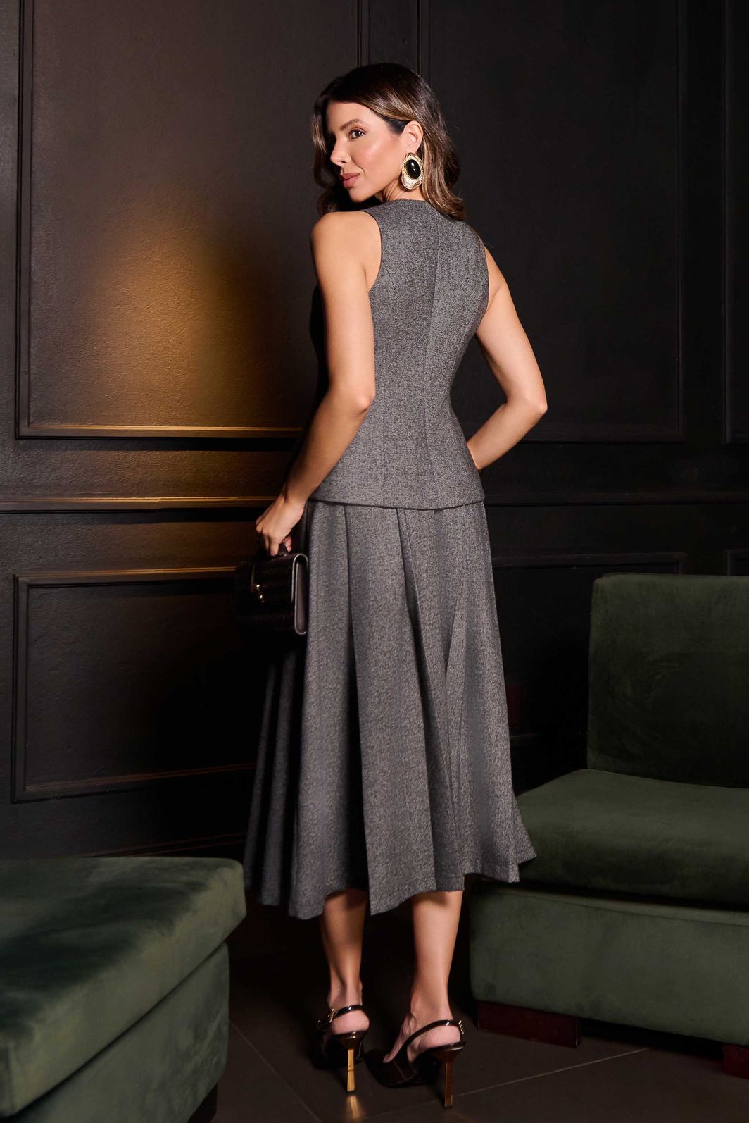 Com modelagem midi e pregas bem estruturadas, proporciona movimento e um caimento impecável que valoriza a silhueta.