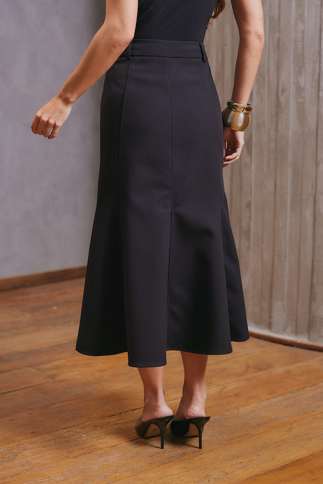 Saia confeccionada em tecido plano, com modelagem de alfaiataria que garante caimento estruturado e elegante.