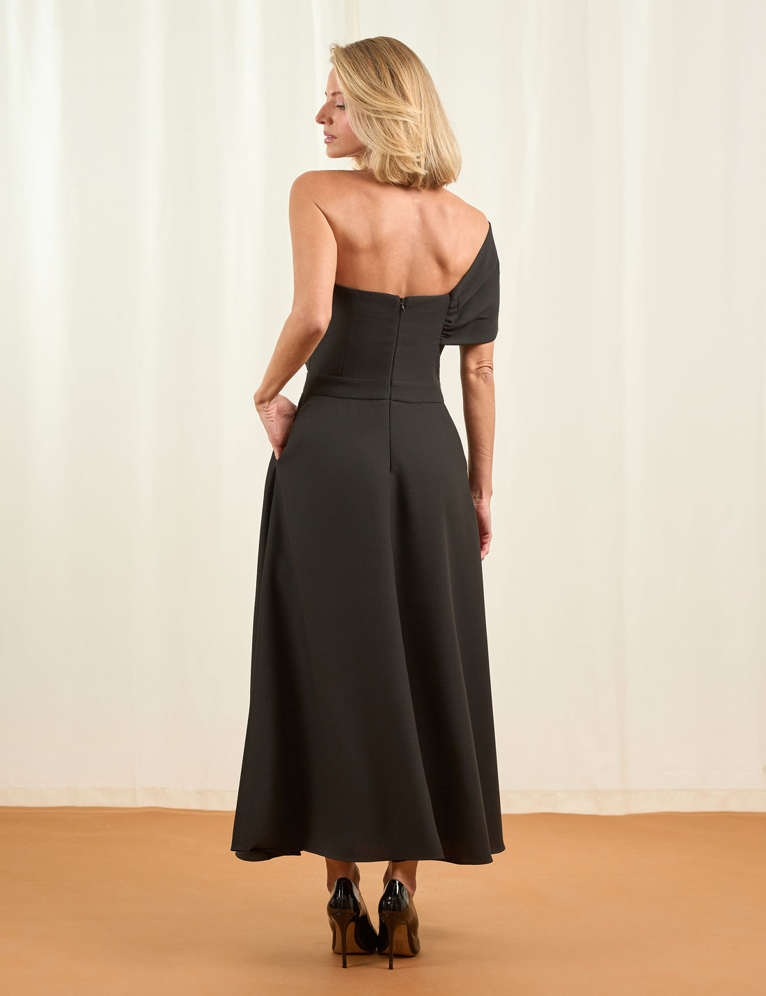AdicionarVestido confeccionado em tecido plano, com modelagem de alfaiataria que garante caimento estruturado e sofisticado. Apresenta decote assimétrico com pala frontal sobreposta, recortes no busto, na cintura que valorizam a silhueta.