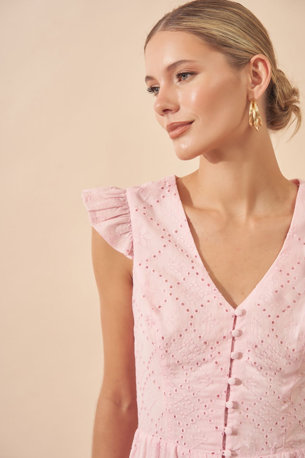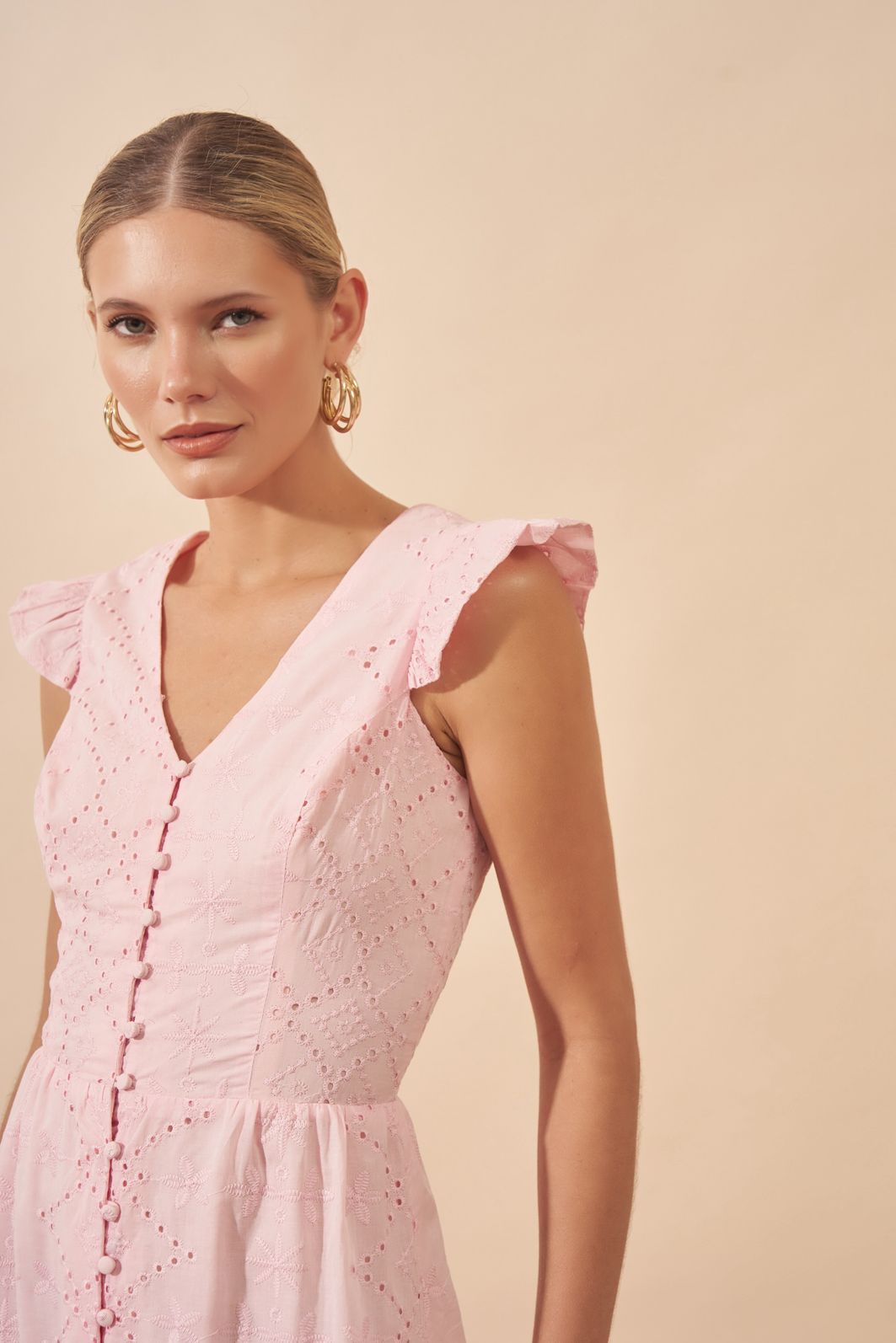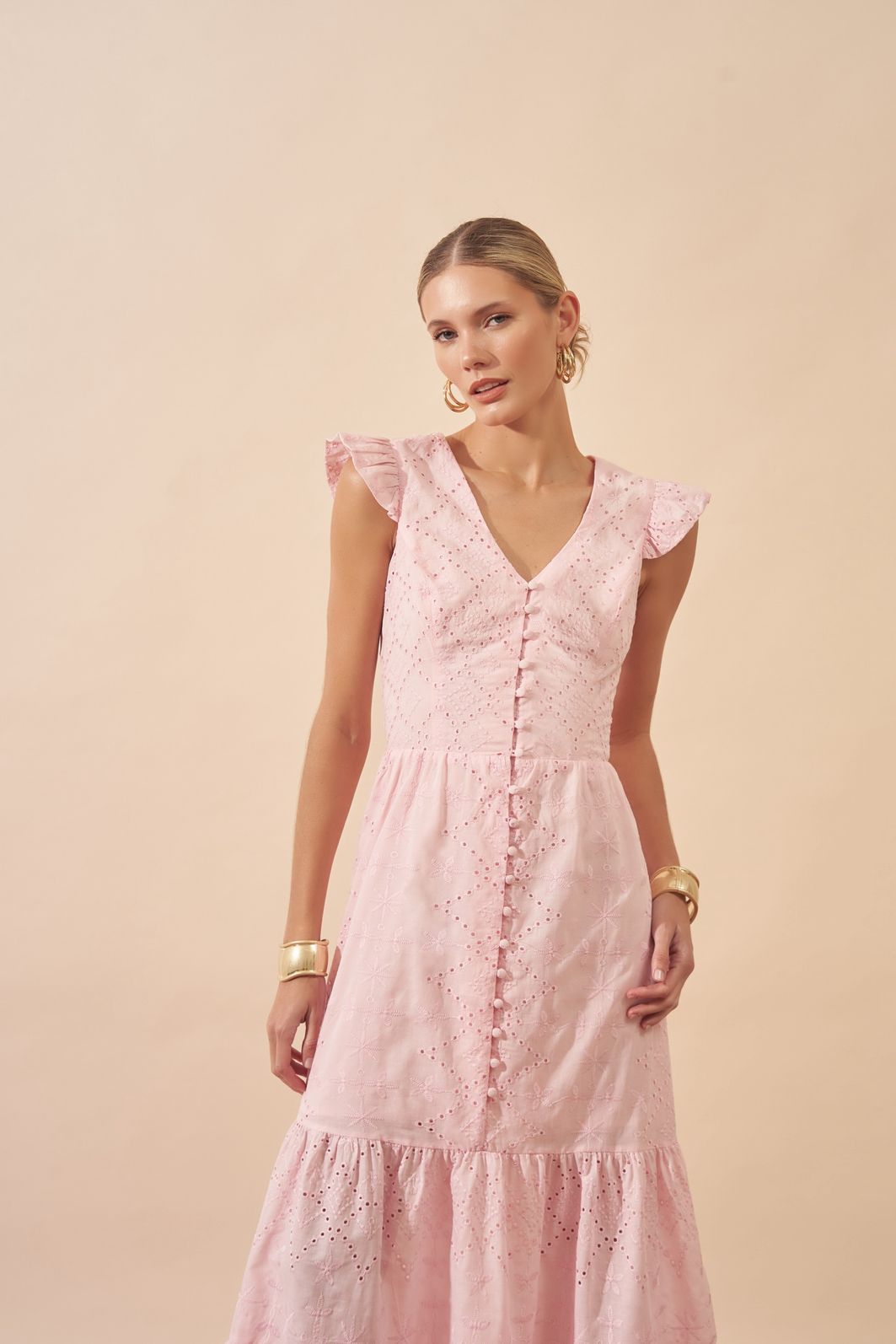 Vestido Laise com Babados e Detalhe em Botões – Milalai é confeccionado em tecido laise suave, proporcionando conforto e caimento leve.