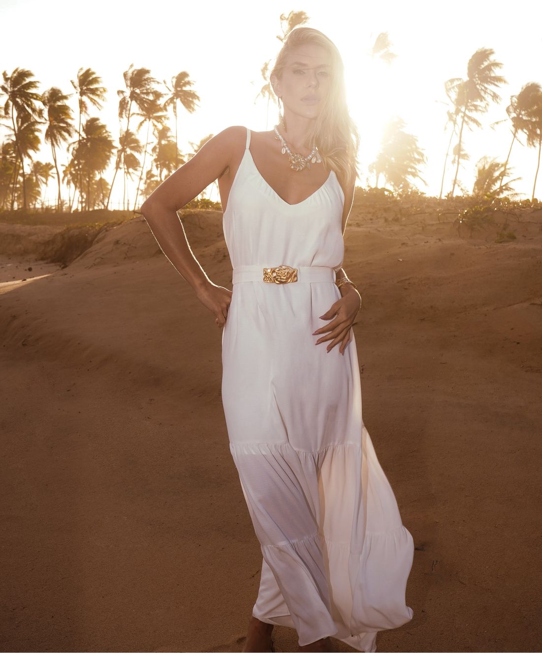Vestido Longo Linen Cinto Aviamento – Donna Ritz é puro charme e sofisticação.