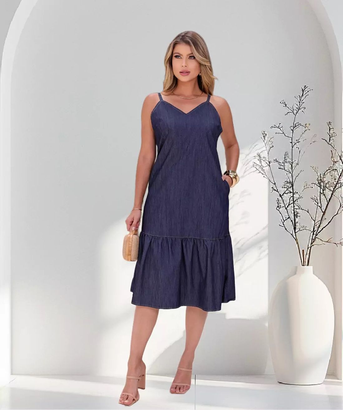 Vestido jeans midi feminino é a escolha perfeita para mulheres que valorizam estilo, praticidade e elegância. Confeccionado em tecido leve, possui alças finas, decote delicado e saia com leve babado, proporcionando movimento e um caimento impecável no corpo.
