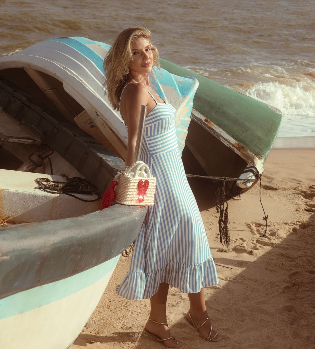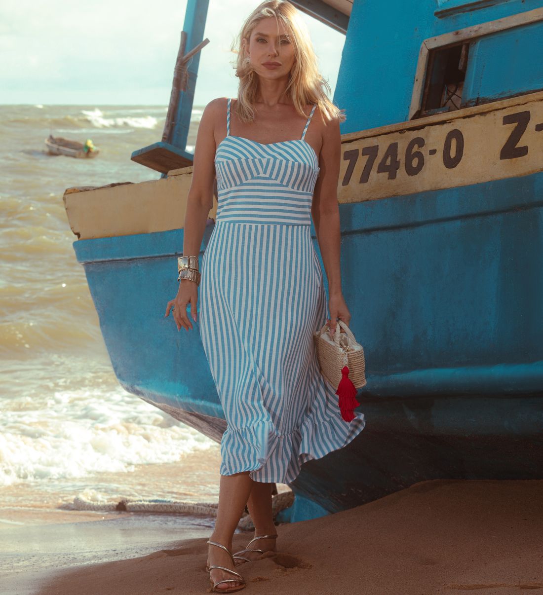A saia midi com babadinho na barra acrescenta movimento e charme, tornando o vestido ideal para ocasiões casuais elegantes, passeios, férias ou eventos diurnos