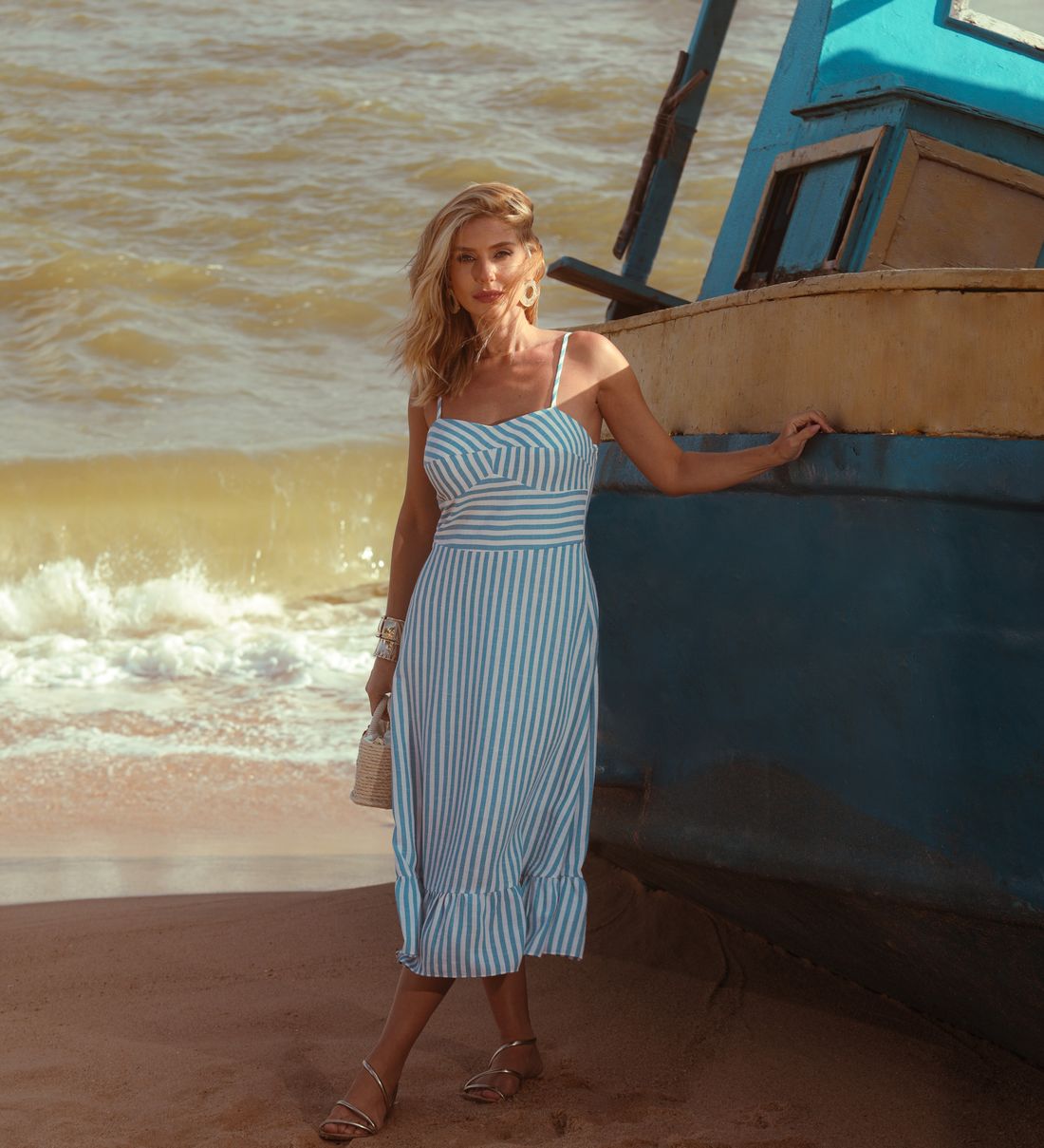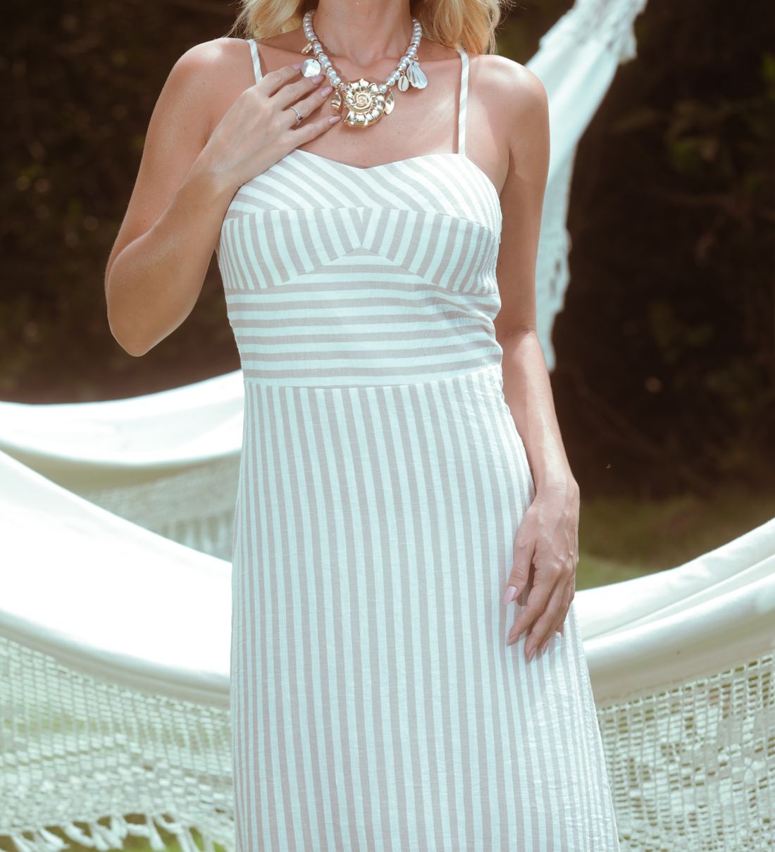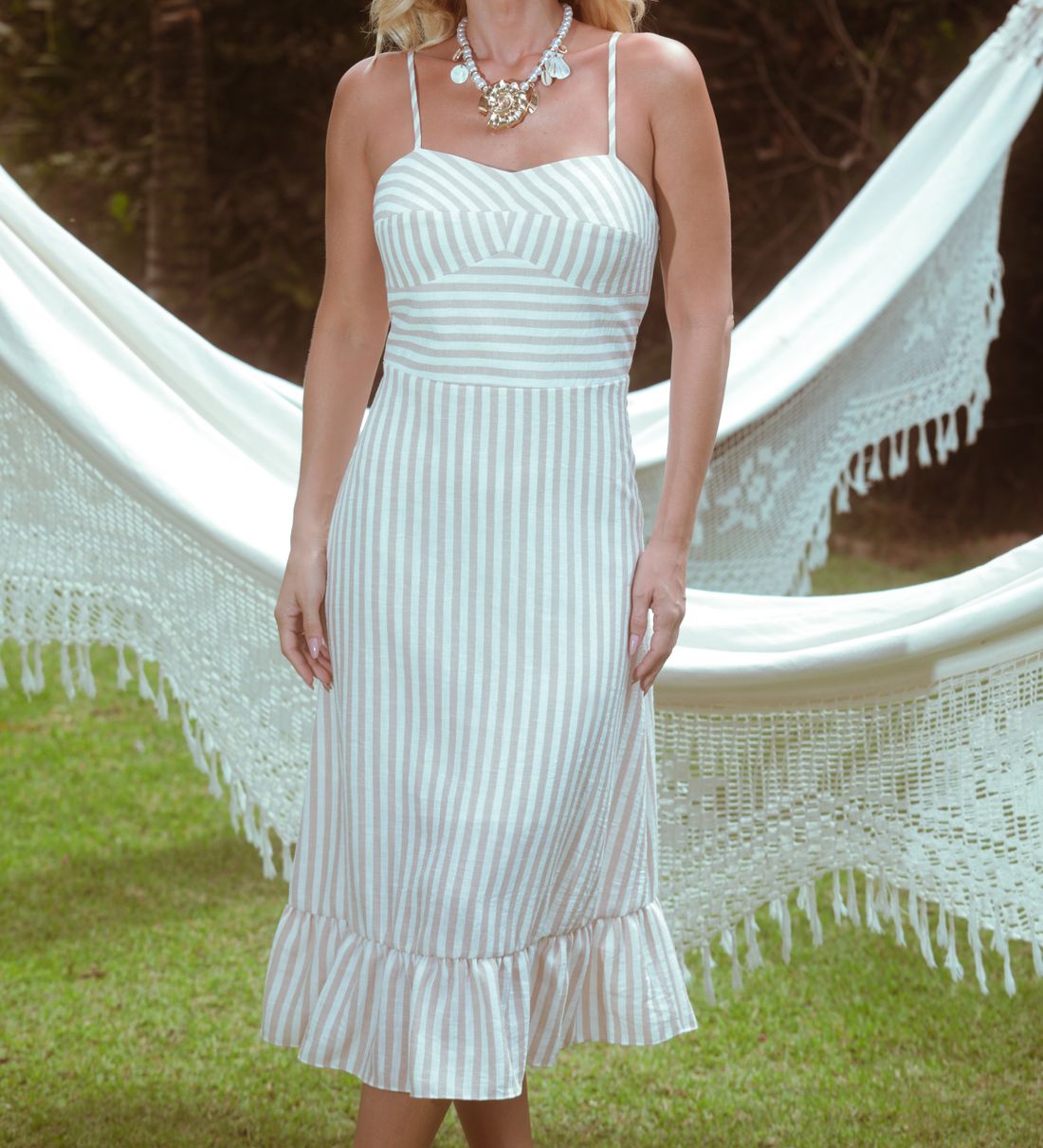 O Vestido Midi Listrado Linen combina frescura, elegância e estilo descontraído num só modelo.