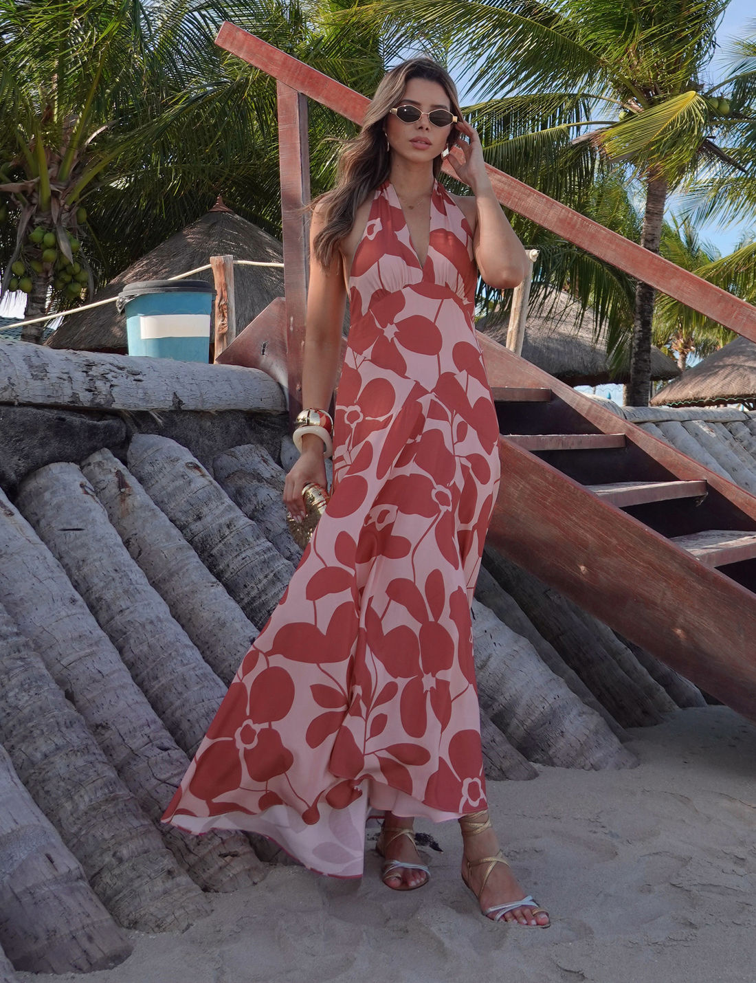 Possui decote em V, frente única com amarração que valoriza o colo, além de recortes frontais e posteriores que realçam a silhueta.