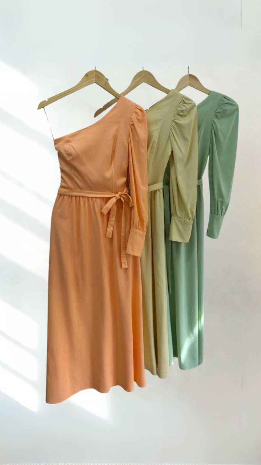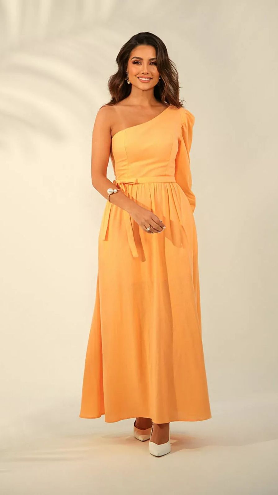 O destaque fica por conta do decote de um ombro só, que traz um toque contemporâneo e refinado à peça.